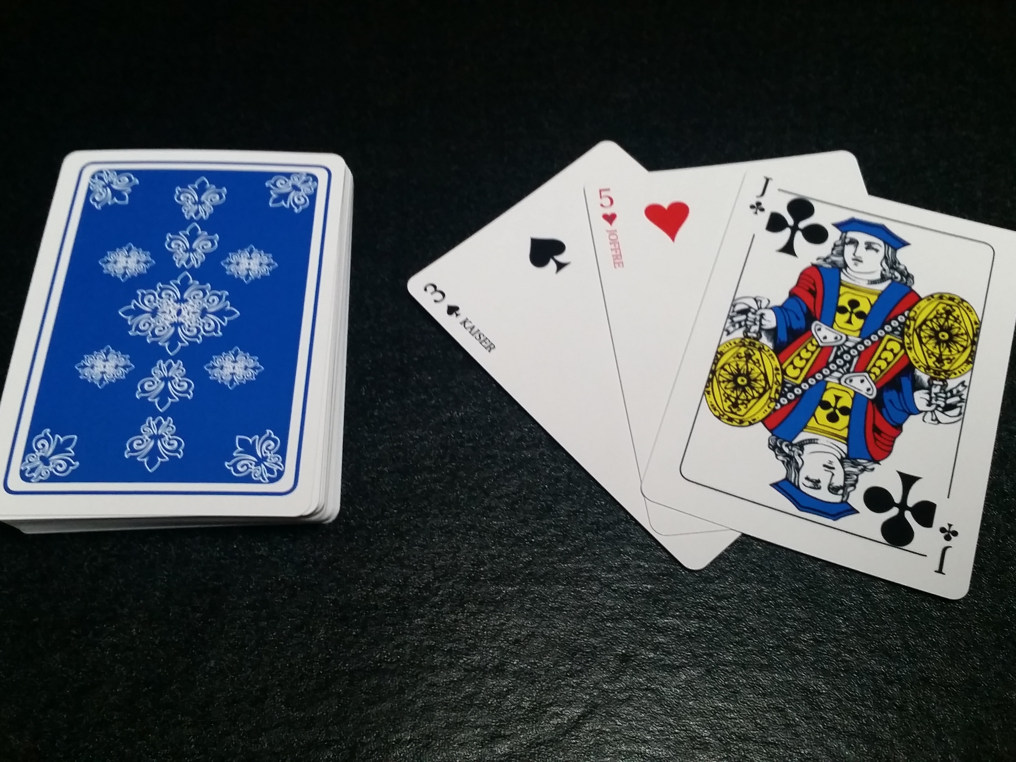 The Joffre deck is used to play a variety of Canadian card games of the same unique family (Joffre, Les Rois, Troika, Three-Spot, Kaiser). This stripped deck includes the extra point cards used in this family of games and uses the Paris pattern for face cards while indexed in English (A, K, Q, J).
